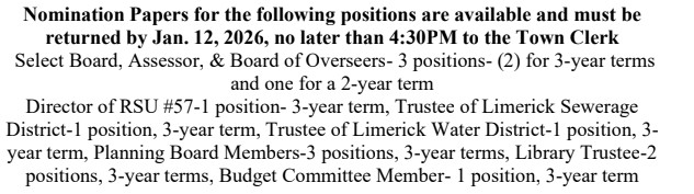 The Town of Limerick is seeking a Park & Recs Director Part Time - Beginning 1/1/2026. Please read posting below and call Alesha Buzzell at 207-793-4475 if interested.